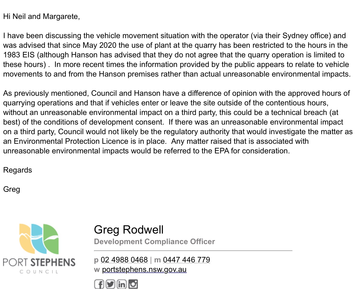 Finally, Port Stephens have overall responsibility for the current Brandy Hill Quarry consent. Should you have any complaints and/or enquiries relating to the approval conditions for the quarry, please lodge them with Council directly. Please note that as the site’s regulatory authority, complaints and/or enquiries regarding the environmental performance of the quarry, may be lodged through the EPA’s Environmental Line.